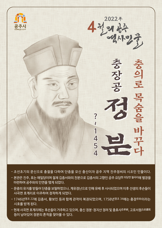 [동양일보 유환권 기자]공주시는 충절을 다해 단종을 모신 충신이자 진주정씨와 공주와의 인연을 처음 맺은 인물인 충장공 정분(사진) 선생을 4월의 역사 인물로 선정했다고 31일 밝혔다.