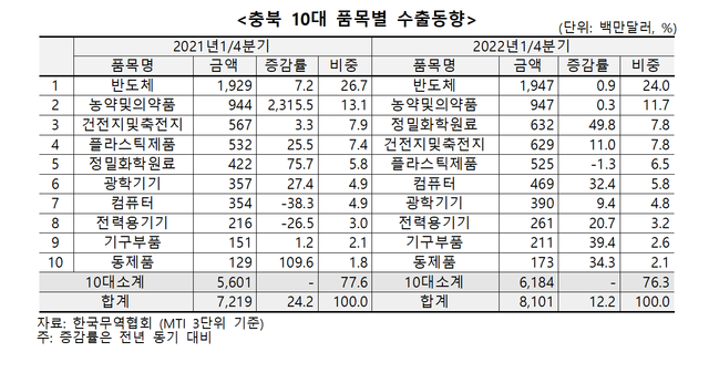 26일 한국무역협회 충북지역본부 1분기 충북지역 동향을 보면 수출이 81억 달러로 전년 대비 12.2% 증가했다.