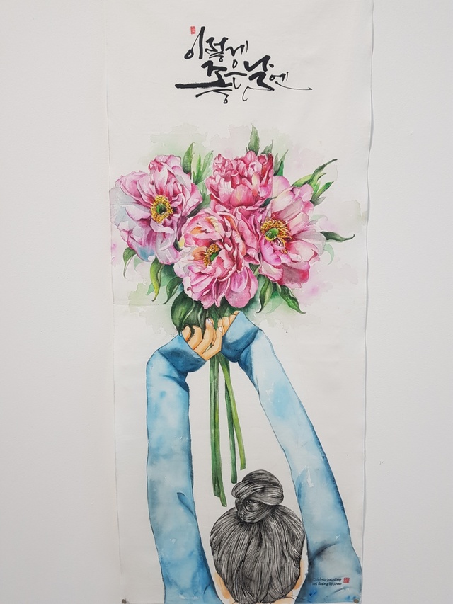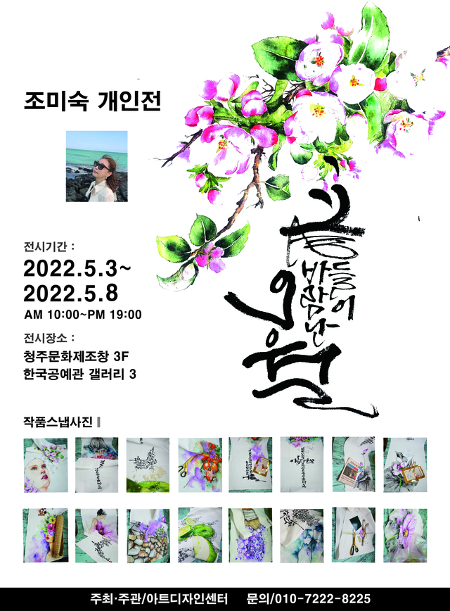 전시 주제는 ‘꽃들이 바람난 오월’로 광목 위에서 펼쳐지는 야생화와 캘리그라피의 감성이 더해져 예술의 일상화를 이루고 있다.