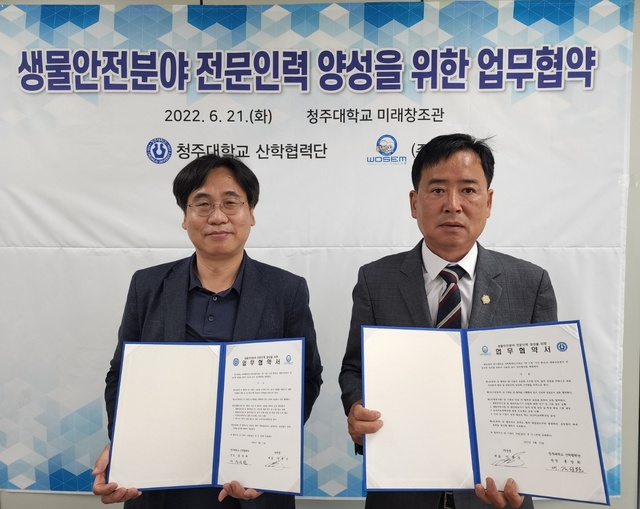 [동양일보 조석준 기자]청주대 산학협력단은 ㈜웃샘과 ‘생물안전 분야 전문인력 양성을 위한 업무협약’을 21일 체결했다.