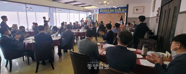 청주대 총동문회는 24일 오후 청주시 상당구 용정동 중화요리전문점 천리향에서 차천수 총장, 교무위원, 동문회운영위원 등 70여명이 참석한 가운데 8회 전국 동시지방선거 당선 동문 축하연을 개최했다.(사진)