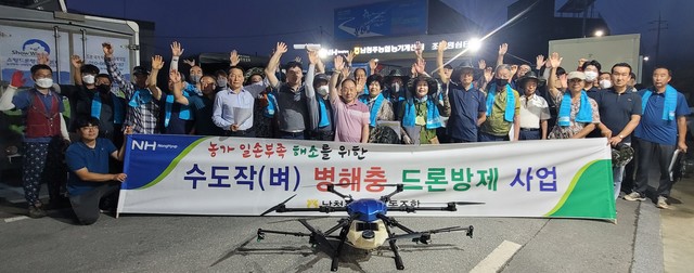 이날 항공방제에는 드론 14대가 투입됐으며 드론 방제 전문가, 영농회장, 직원 등 약 60여명이 방제에 참여했다.