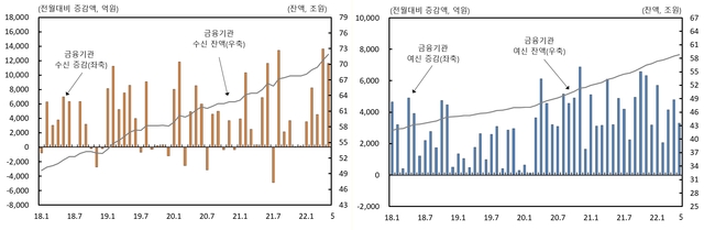 예금은행 수신은 5월에 8261억원이 늘었다. 요구불 예금(693억원) 증가폭은 축소된 반면 저축성 예금(7232억원)이 금리 상승에 힘입어 높은 증가세를 보였다.