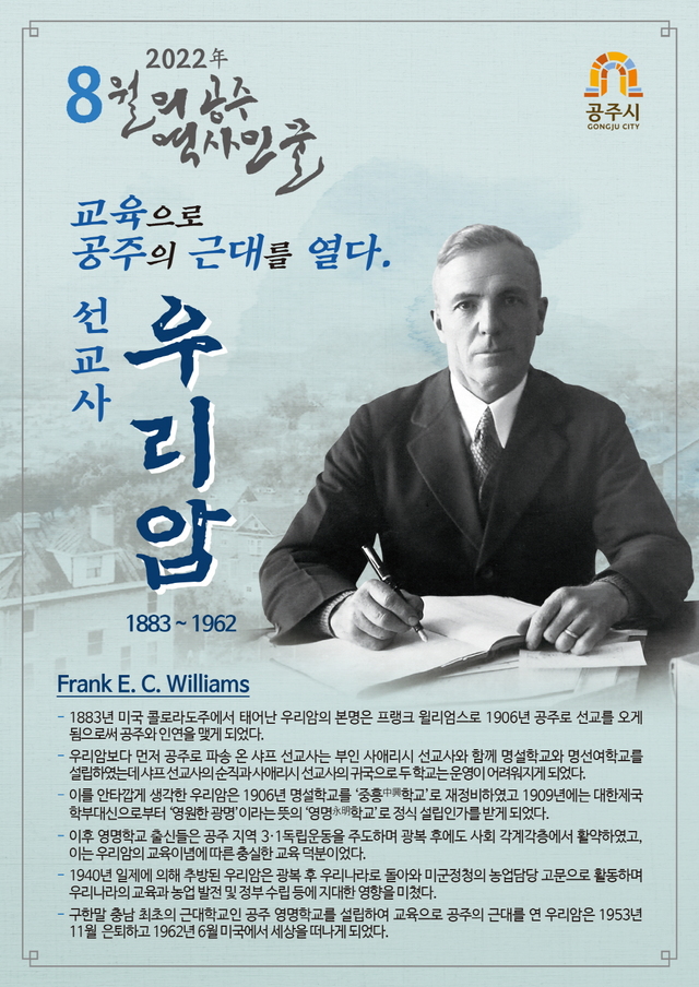 1883년(고종 20) 미국 콜로라도주에서 태어난 우리암 선생의 본명은 프랭크 윌리엄스로 1906년 공주로 선교를 오게 되면서 공주와 인연을 맺게 됐다.