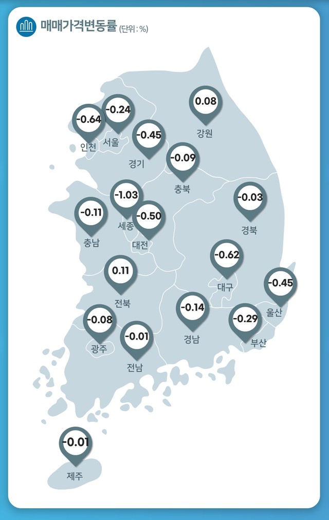 [동양일보 이정규 기자]8월 전국 주택종합 매매가격이 0.29%, 큰 폭으로 하락한 가운데 세종이 전국에서 낙폭이 가장 컸으며, 대전이 네번째를 기록했다.