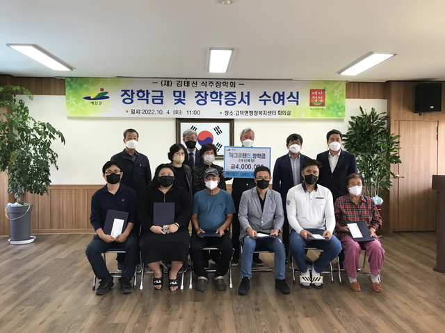 [동양일보 서경석 기자]재단법인 김태신 삭주장학회(이사장 김영배, 태신목장)이 최근 예산군 고덕면행정복지센터를 방문해 ‘아그로랜드(태신목장) 장학금’ 400만원을 지역내 대학생 2명(각 100만원)과 고등학생 4명(50만원)등에 모두 400만원이 전달했다.예산 서경석 기자