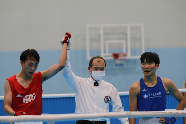 [동양일보 맹찬호 기자]충북 복싱 기대주 김윤섭(서원대)이 복싱 남자대학부 라이트급웰터급 –64㎏ 예선 첫 경기에서 승리했다.