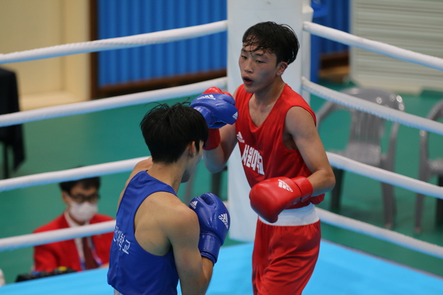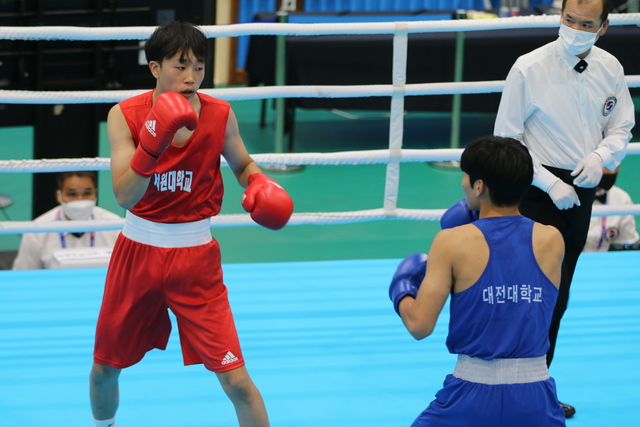 7일 울산덕신초등학교 체육관에서 열린 복싱 남자대학부 라이트웰터급 –64㎏ 예선경기에서 충북 김윤섭(서원대)이 대전 홍승호(대전대)와의 대결에서 승리의 주먹을 날렸다.