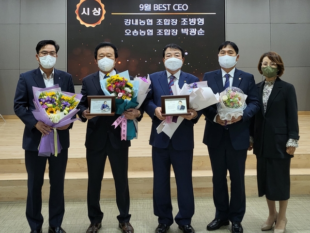 [동양일보 이정규 기자]농협충북본부는 12일 강내농협 조방형 조합장과 오송농협 박광순 조합장이 NH농협생명 ‘9월 충북 농축협 BEST CEO상’ 수상자로 선정됐다고 밝혔다.