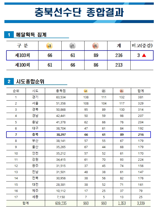 충북선수단은 48개 종목에 선수 1146명, 임원 437명 등 총 1583명이 참가해, 금메달 66개, 은메달 61개, 동메달 89개 등 총 216개의 메달, 총득점 3만8297점으로 종합 7위를 차지하며, 역대 최고 종합득점과 메달을 획득하는 성과를 거뒀다. 지난 100회 전국체전 대비 총 메달이 3개 늘었다