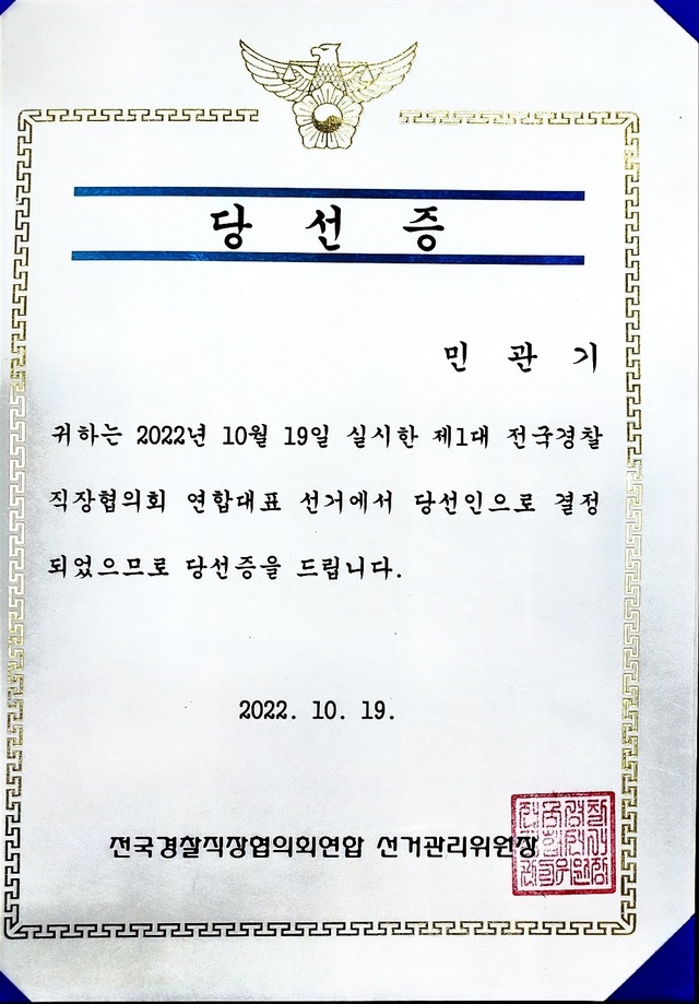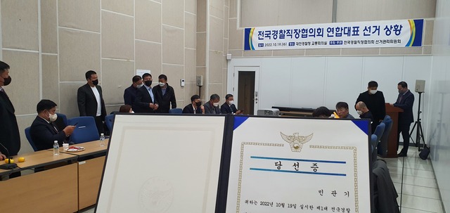 이날 대전경찰청 교통회의실에서 열린 전국경찰직장협의회 연합대표 선거에서 민 회장은 252표 중 104표(41.2%)를 얻어 전국 연대 초대회장으로 선출됐다. 2위인 서강오 전남청 무안경찰서 직장협의회장은 90표를 획득했다. 안성주 전 울산남부경찰서 직장협의회장은 47표, 이소진 경찰청 직장협의회장은 7표, 남용희 서울서초서 직장협의회장은 4표를 받았다.