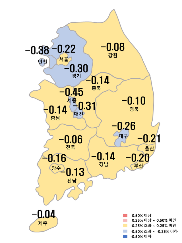 충청권도 대전이 0.88%, 충북이 0.19%, 충남이 0.21%, 세종이 0.35% 각각 떨어졌다.