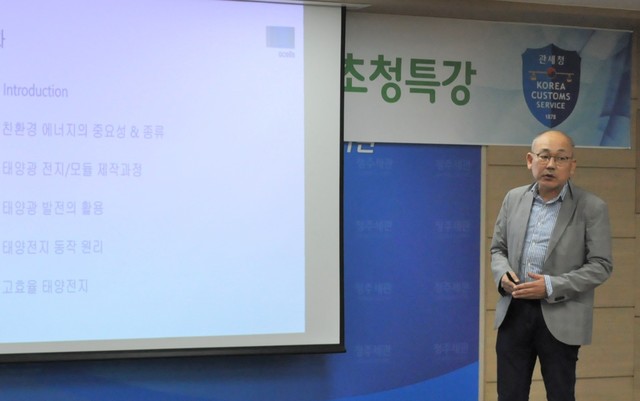 이날 특강은 청주세관의 주요 수입 통관물품인 태양전지의 원리, 원재료와 제조공정에 대한 설명과 최근의 기술 발전 동향을 중심으로 진행됐다.