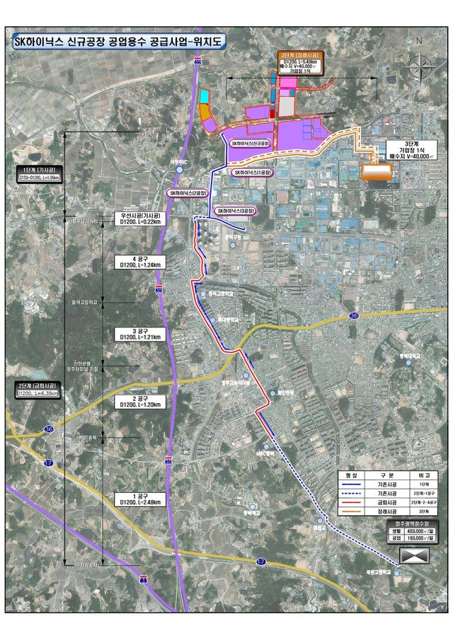 지난 31일 시에 따르면 이 사업은 SK하이닉스가 855억원을 부담해 청주광역정수장(한국수자원공사 청주권지사)에서 청주테크노폴리스에 위치한 SK하이닉스 M15공장까지 공업용수관로 13.7km, 배수지 4만t, 가압장 1식을 신설하는 사업이다.