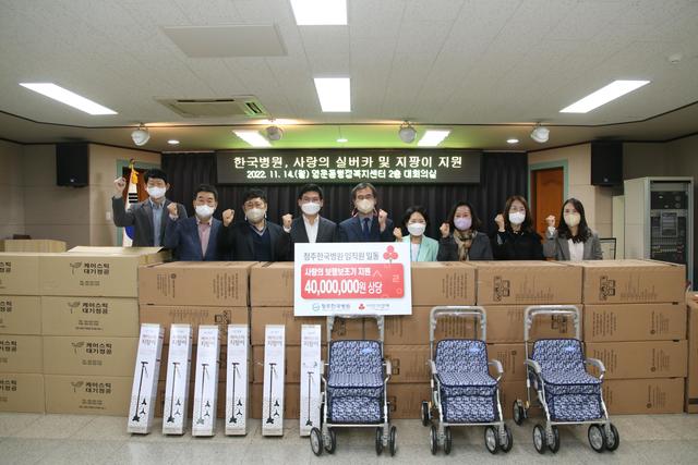 [동양일보 김미나 기자]청주한국병원(병원장 송재승)이 14일 영운동주민센터에서 거동이 불편한 저소득 노인을 위해 써달라며 충북사회복지공동모금회(회장 노영수)에 4000만원 상당의 보행 보조기(실버카, 지팡이)를 전달했다. (사진)