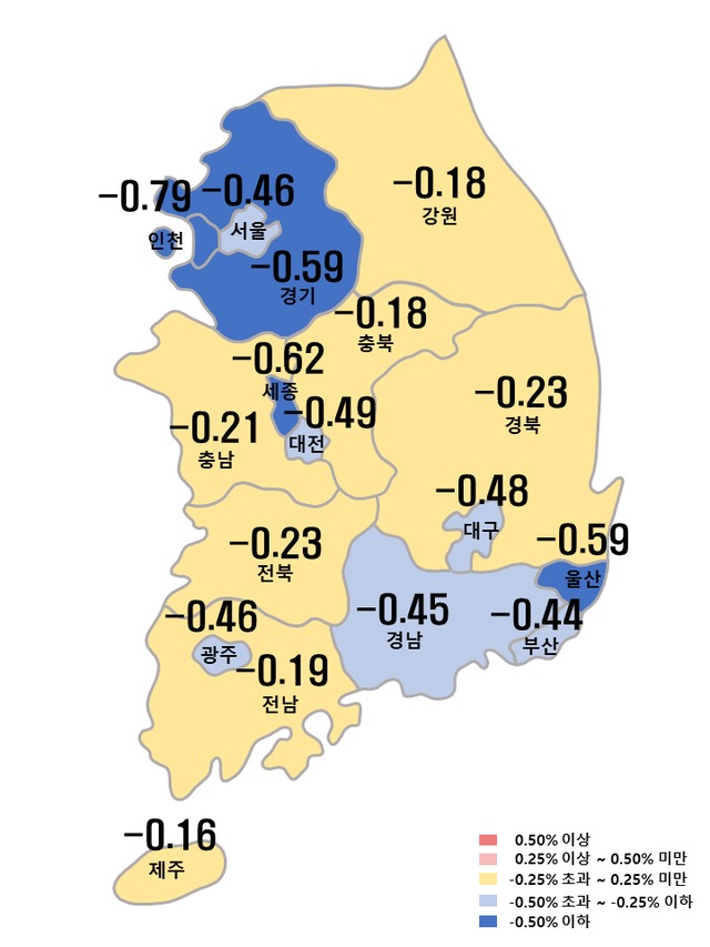 세종은 전주(-0.55%)보다 확대돼 0.62% 하락했으며, 대전도 전주(-0.41%)보다 큰 0.51% 떨어졌다.