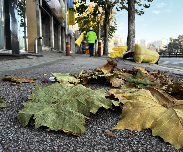 가을바람이 불며 낙엽이 떨어지는 모습은 보기 좋지만, 길바닥에 무수히 나뒹구는 낙엽 처리는 누군가의 몫이다.