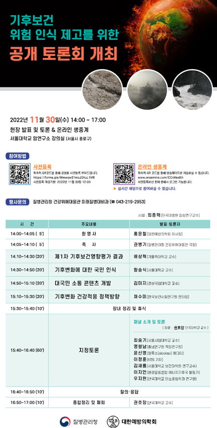 이번 공개토론회는 질병관리청과 대한예방의학회가 공동으로 주관해 우리나라에서 처음으로 진행된 ‘기후변화에 따른 국민 건강영향 인식도 조사’ 결과를 발표했다.