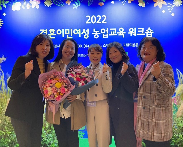 [동양일보 이정규 기자]태국에서 시집 온 충북 옥천농협 소속 공카녹펀(왼쪽 두번째)씨가 30일 서울 스텐포드호텔에서 열린 농림축산식품부와 농협중앙회가 주최, 주관한 결혼이민여성 리더경진대회에서 ‘사회활동부문’ 우수상을 수상하고 농협 직원들과 포즈를 취하고 있다. 이정규 기자 siqjaka@dynews.co.kr