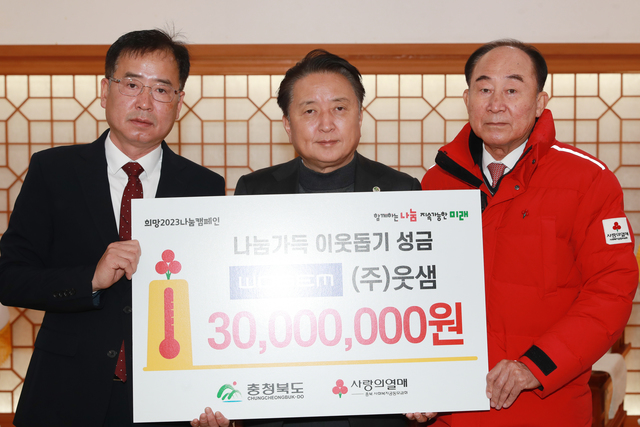 [동양일보 도복희 기자] 충북도는 29일 도지사 집무실에서 ㈜웃샘(대표 이명식), 충북사회복지공동모금회와 함께 성금 기탁식을 했다.(사진)