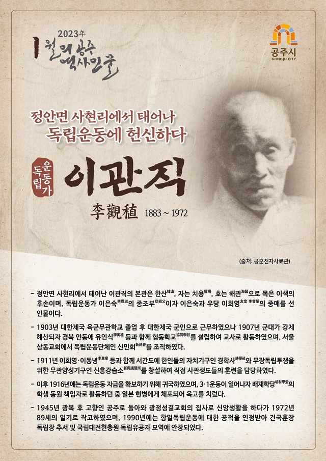 [동양일보 유환권 기자]공주시는 정안면 사현리에서 태어나 애국계몽운동, 무장독립투쟁 등을 통해 대한민국의 독립을 위해 헌신한 독립운동가 이관직 선생을 1월의 역사 인물<사진>로 선정했다고 30일 밝혔다.