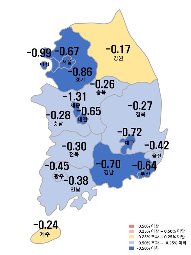 시도별로는 세종(-1.31%)이 가장 낙폭이 컸으며, 인천(-0.99%), 경기(-0.86%), 대구(-0.72%), 경남(-0.70%), 서울(-0.67%), 대전(-0.65%), 부산(-0.64%), 광주(-0.45%) 등 전체적으로 하락했다.