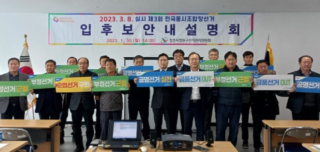[동양일보 이정규 기자]농협청주시지부(지부장 오희관)와 청주시 청원구선거관리위원회(사무국장 김기영)는 30일 청원구선관위에서 3회 전국동시조합장선거 입후보안내 설명회를 갖고 공명선거실천 결의대회를 했다.