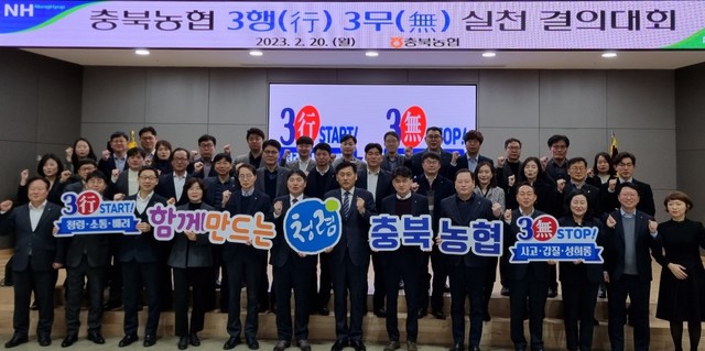 [동양일보 이정규 기자]충북농협은 20일 지역본부 대강당에서 이정표 충북농협 총괄 본부장과 황종연 농협은행 충북본부장 등 법인대표 및 직원 등 50여명이 참석한 가운데 ‘3행(行) 3무(無) 실천운동’ 결의대회를 열었다.