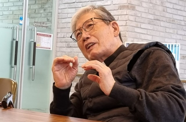 3월15일 오후 2시. 복대카리타스노인요양원 서명선 원장의 안내로 접견시간 1시간을 약속하고 두 번째 방문을 했다. 지팡이를 짚은 김 신부가 부축을 받으며 나타났다. 로만칼라에 은발 머리, 25년 간 그를 괴롭힌 파킨슨병의 떨림 증세를 버티느라 애를 쓰는 모습이 역력하다. 그의 앉은 자세는 시간이 갈수록 한 쪽으로 점점 기울고 있었다.