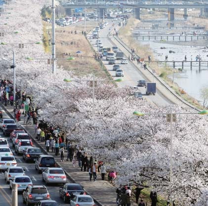 물줄기를 따라 줄을 잇고 있는 벚나무들의 성급한 속잎이 피어나는 봄이 오고, 3월 하순에서 4월 초엔 어김없이 가지마다 꽃등이 피고 꽃타래는 늘어져 꽃터널을 이루고, 기다렸다는 듯