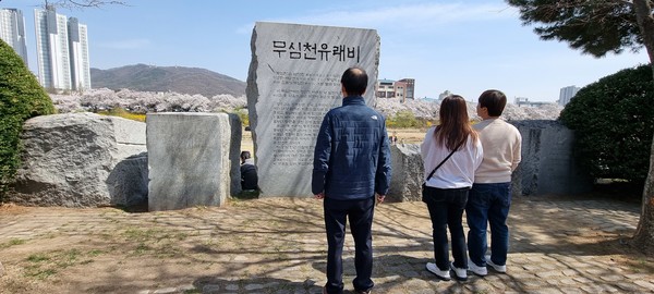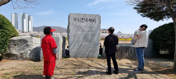 무심천을 오가는 무수한 시민들이, 이 시정 넘치는 무심천의 유래에 관심 갖지 않아서야 되겠는가 싶어 전문을 옮겼다. (이 비가 세워진 이후, 어떤 불교 일파에서 불교를 욕되게 하였다하여 ‘행자승’을 ‘행인’으로, ‘부끄러워하며’를 ‘불쌍히여기어’로 바꾸는 등 교정을 했다고 들었다. 나무에 눈을 가려 숲을 보지 못한 우愚는 아닌지…)