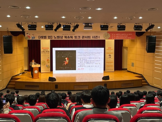 1부는 200명의 학생이 참여해 서울대학교 생명과학부 홍성욱 교수의 ‘노벨상의 역사와 과학철학’이라는 주제로 노벨상을 이해하는 데 도움이 되는 강연이 진행됐다.<사진>
