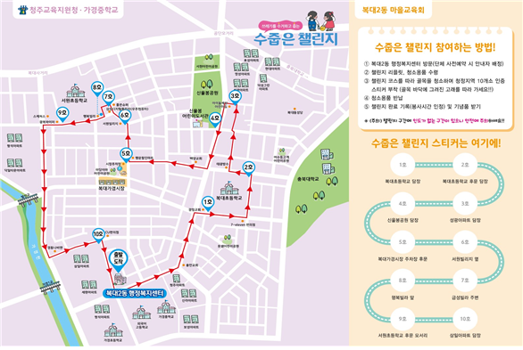 2020년 9월부터 이어진 협업체계는 환경취약지를 청정지역으로 변화시켰고, 이를 이어가기 위해 지난해 11월 11일부터 전국 최초 챌린지형 줍깅 프로그램인 ‘수줍은 챌린지’를 운영하고 있다. 또 청주형마을교육회 공모사업에 선정돼 확보한 사업비 1600만원으로 청정지역 홍보판을 설치하기도 했다.