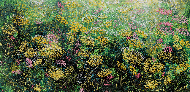 전시 대표작은 ‘나는 너에게 너는 나에게 하나의 의미가 되고 싶다’라는 작품이다. 작가의 시(詩) 사랑이 엿보인다. 점과 선으로 표현됐지만 자세히 들여다보면 사람의 형상들이 수도 없이 모여 꽃과 꽃 무리 같은 형상을 이룬다.