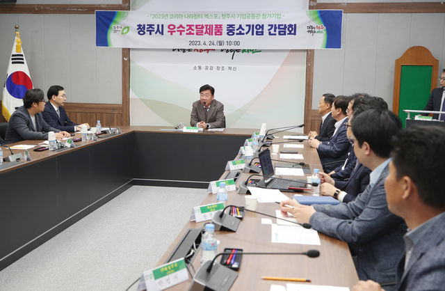 [동양일보 신우식 기자]청주시는 24일 임시청사 소회의실에서 우수조달제품 생산 중소기엄 간담회를 개최했다. 간담회에는 이범석 청주시장과 우수기업 대표 14명이 참석했다.