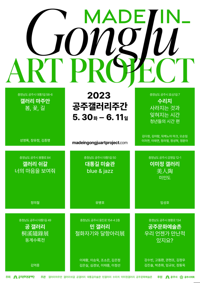 2023 공주갤러리주간 타이틀은 ‘MADE IN_Gongju Art Project’다. 공주지역에서 활동하는 예술가는 물론 공주지역에 거주하지 않더라도 새로운 예술적 시도를 모색하는 예술가들이 공주시에 모여 예술의 가능성과 비전을 공동으로 실험하고 제시한다는 의미를 내포하고 있다.