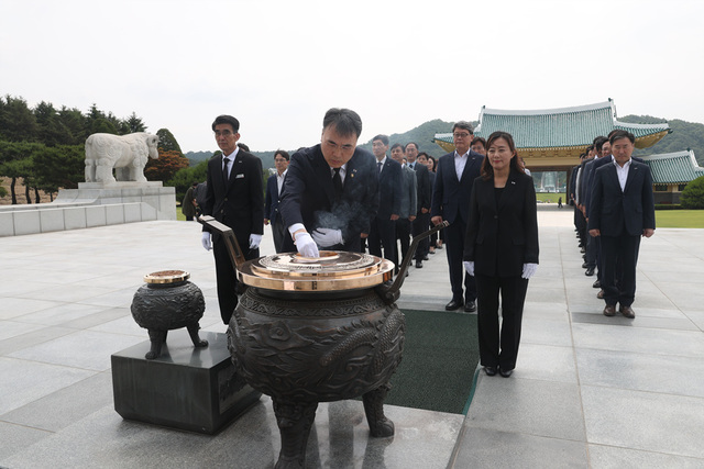 [동양일보 이정규 기자]이종욱(가운데) 조달청장을 비롯해 조달청 간부들이 지난 5일 68회 현충일을 앞두고 대전 유성구 국립대전현충원을 찾아 현충탑에 헌화하고 순국선열과 호국영령을 기리며 참배했다.