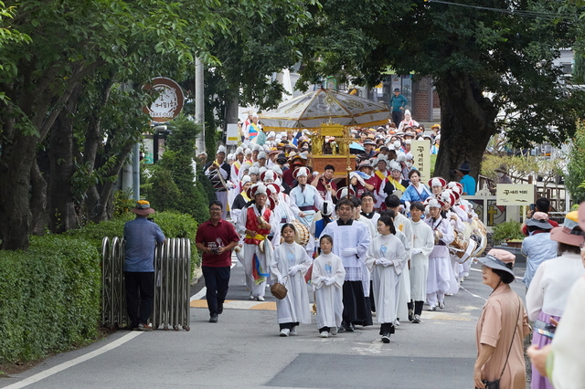 미사 후에는 성체 가마가 공세ㅔ리 성당과 성벽길, 마을길을 따라 이동하자 그 뒤를 200여명의 풍물패와 50기의 깃대, 600여명의 신자들이 따르면서 공세리 성당이 차지하는 위상을 보여줬다.