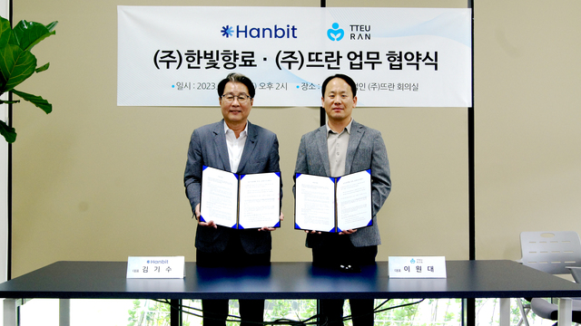 (주)뜨란은 지난 4일 대한민국 대표 향료기업인 ㈜한빛향료와 식물성 대체단백식품(대체육, 음료, ISP, CSP 등)개발 협력을 위한 상호 업무 협약을 했다.<사진>