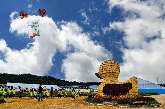 이 작품은 2022괴산세계유기농산업엑스포 기간 옥수수와 수수로 만든 4m가량의 오리잡곡탑으로 행사장 메인포토존으로 사랑받았던 상징물이다.