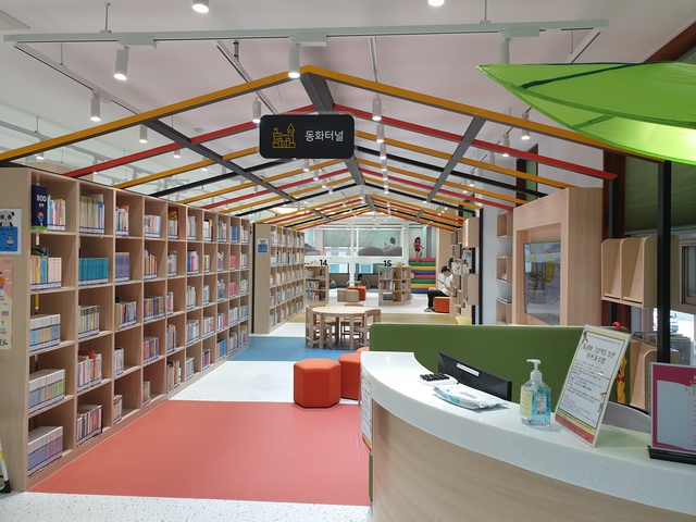 2층은 어린이자료실이다. 영유아놀이와 호기심 가득한 공간이다. 동화터널은 아이들에게 재미를 선사한다. 대형TV에서는 온라인 원화전시를 관람할 수 있다. 안전 보강과 빈백을 비치해 즐거운 책읽기가 가능하다. 엄마와 아기가 주로 방문하는 곳이라서 수유실도 갖춰져 있다. 한 공간에서 유아실, 저학년, 고학년, 가족열람석을 구분해 자연스럽게 융화가 가능하도록 구성돼 있다.
