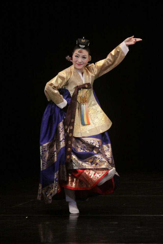 “우선 충남 홍성 출신으로 한국의 명고名鼓명무名舞로 일컫는 한성준(韓成俊·1874~1941)옹이 우리나라 전통 춤을 주제의식을 갖고 체계화하고 집대성하여 무대예술로 승화시킨 대표적인 춤의 하나가 ‘태평무’지요. 그분의 손녀이자 제 스승인 벽사碧史한영숙(韓英淑· 1920~1989. 국가무형문화재)명인名人에 의해 전해졌으며, 왕과 왕비가 추는 2인 춤으로 춤의 길이는 11분쯤입니다. 태평성대에 대한 꿈의 실현과 평화 의지를 춤동작으로 표현하고 있는 품격 높은 춤이지요. 복장부터가 웃옷인 당의唐衣에 2단 금박인 대란청색 겉치마 속에 금박 1단 빨강색 치마를 받쳐 하얀 버선발의 조화롭고 조심스런 발동작이 눈에 들어오는 춤이지요. 상의의 두록색은 간색으로 음陰, 치마는 청색으로 양陽의 조화까지를 나타내는 등 그 격조는 비길 데가 없습니다. 저는 이제껏 태평무에 제 춤 인생을 걸고 있으면서도 아직도 이 정도면 이 춤의 진수를 알겠다고 만족해 본적이 없어요. 그토록 어렵고, 오묘하고, 절제적이면서도 깊은 호소력이 있는 춤입니다.”