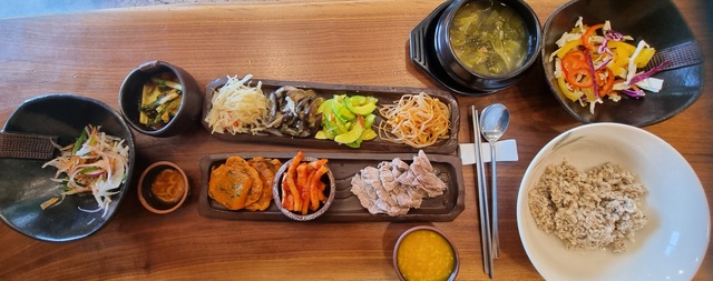 [동양일보 도복희 기자]솔밭보리밥집&솔밭카페(대표 김애영 65·사진)에서 내놓는 것은 건강한 밥상이다. 보리밥과 수육이 한 상에 올라온다. 우거지된장국과 2가지 종류의 샐러드가 따라오고 콩나물, 호박나물, 가지나물, 감자채볶음과 열무김치에 고추장과 참기름을 넣어 쓱쓱 비빈 보리밥은 더위로 잃어버린 입맛을 되찾기에 최고다. 여기에 고추장 장떡이나 무생채를 얹은 수육를 먹고 나면 든든하다. 식전에 먹는 호박죽과 후식으로 직접 내려주는 원두커피는 덤이다. 대접받는 느낌이 드는 한상차림인 셈.