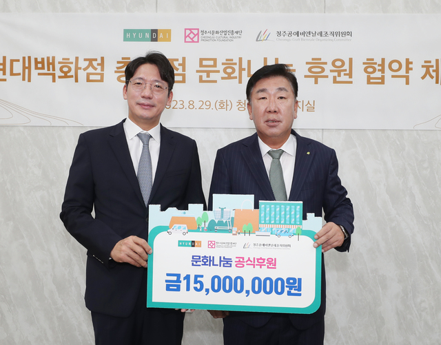 이날 현대백화점 충청점은 미래 세대를 위한 청주 문화예술 발전과 공예비엔날레 성공 개최를 위해 써달라며 1500만원을 기탁했다. 김미나 기자