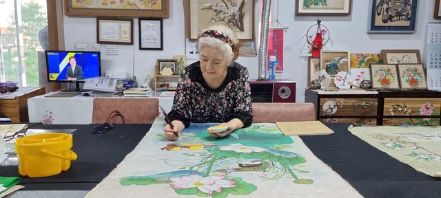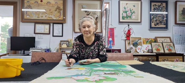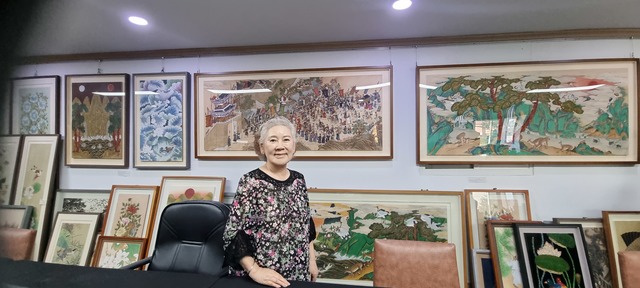 [동양일보 도복희 기자]어떤 공간은 그곳에 살아가는 사람을 말해주기도 한다. 충북 보은군 보은읍 보청대로 1865(교사리)에 위치한 백향민화갤러리(관장 김옥지 78·사진) 역시 그러했다. 마당이 넓은 1층 건물이었다. 건물은 화려하지 않았고 담백한 느낌이었다. 건물 안으로 들어서자 수많은 민화 작품들이 전시돼 있었다. 현재 작업 중인 작품들도 책상에 그대로 놓여 있었다. 온갖 아름다운 색채들을 모아 놓은 듯 작품들마다 은은한 색의 향연에 한동안 인터뷰를 미루고 작품 감상에 빠져들었다. ‘화접도’, ‘매화가리개’, ‘모란도’, ‘화조도’, ‘파초닭’, ‘십장생’, ‘봉황도’, ‘외출’ 등 눈길 닿는 작품마다 섬세한 붓터치가 마음을 사로잡았다.