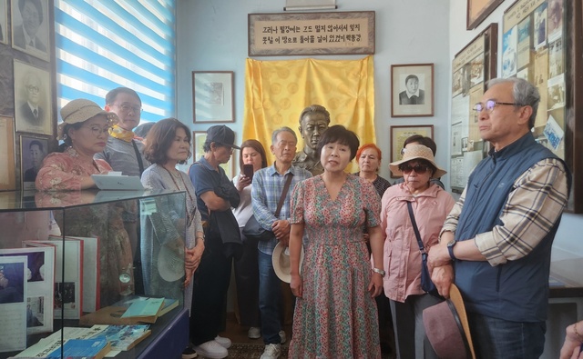 [동양일보]필자도 우즈베키스탄의 수도 타슈켄트에 있는 ‘포석조명희문학기념실’을 이미 다녀간 사람들이 찍은 사진과 자료로만 봤을 뿐 이번에 처음 방문한 것이다. 설레는 마음은 다른 탐사단 일행과 같은 기분이었다. 현지 가이드의 안내에 따라 걸어서 층계를 올라 드디어 4층에 도착했다. 사진으로 봤을 때보다 더 좁고 누추했다. 30명이 넘는 탐사 인원이 한꺼번에 들어가 둘러보기 어려운 공간 구조였기 때문에 출입문 양쪽을 활짝 열어 공간을 확보했다. 들어서자 맨 처음 눈에 띄는 것이 포석의 ‘흉상’이었다. 포석과 닮은 얼굴은 아니었지만 형형한 눈과 굳게 다문 입술 그리고 정면을 응시하고 있는 모습이 그가 걸어간 선구자의 결의에 찬 삶을 함축하고 있는 것 같아 옷깃을 여미게 했다.