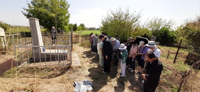 [동양일보]이번 탐사단의 일정은 모두 엄선해 선택한 특별한 여정이었지만 그중에서도 포석의 아내 황명희와 장녀 조선아의 묘를 참배한 일은 마치 포석의 묘를 참배하는 듯한 흥분을 갖게 했다. 원래 살았던 마을에서 들판 안쪽으로 더 들어가서야 비로소 묘를 찾을 수가 있었는데 탐사단을 태운 버스가 더 들어가지 못했기 때문에 일행은 삼삼오로 걸어서 오랜만에 한국의 들녘을 걷는 기분으로 농로처럼 탁 트인 길을 걸어 들어갔다. 딱히 이정표라든가 안내 지도가 나와 있는 게 아니었기 때문에 묘를 찾는 어려움이 예상됐지만 다행히 유영선 주필이 구글(googie)을 실시간으로 잘 활용한 순발력과 한국에 있는 조선아의 외아들 김 안드레이와 통화를 한 덕분에 이국땅 초행길에서 낭패를 보는 일은 면할 수가 있었다.