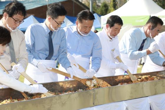 이날 김영환 도지사를 비롯한 식품단체협의회장 등이 참여해 충북도민이 하나가 될 수 있도록 기원하는 비빔밥을 만들어 관람객들에게 나눠 줬다.