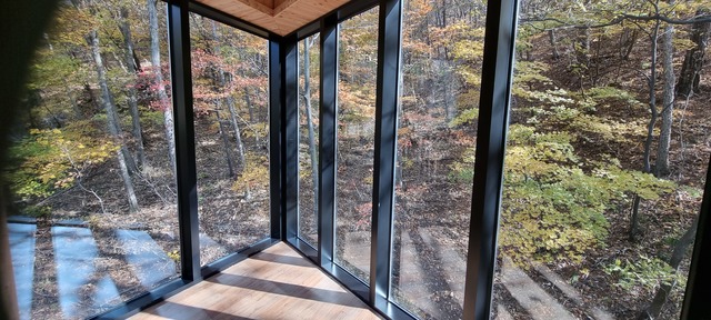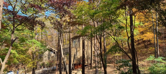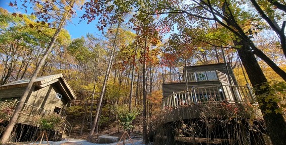 트리하우스 통창으로 펼쳐지는 가을숲은 한 폭 그림