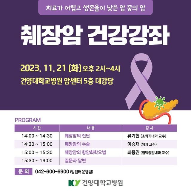 [동양일보 정래수 기자]건양대병원은 오는 21일 암센터 5층 대강당에서 ‘췌장암’ 건강강좌를 진행한다.